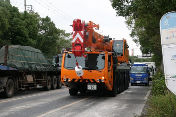 150tクレーンは2019年1月16日現在、道路交通法上、公道を自走できる最大重量のクレーンなのです。 その為、自走可能のクレーンの限界であった、140tクレーンでは吊り上げられなかった重量物を、吊り上げることができるのです。
